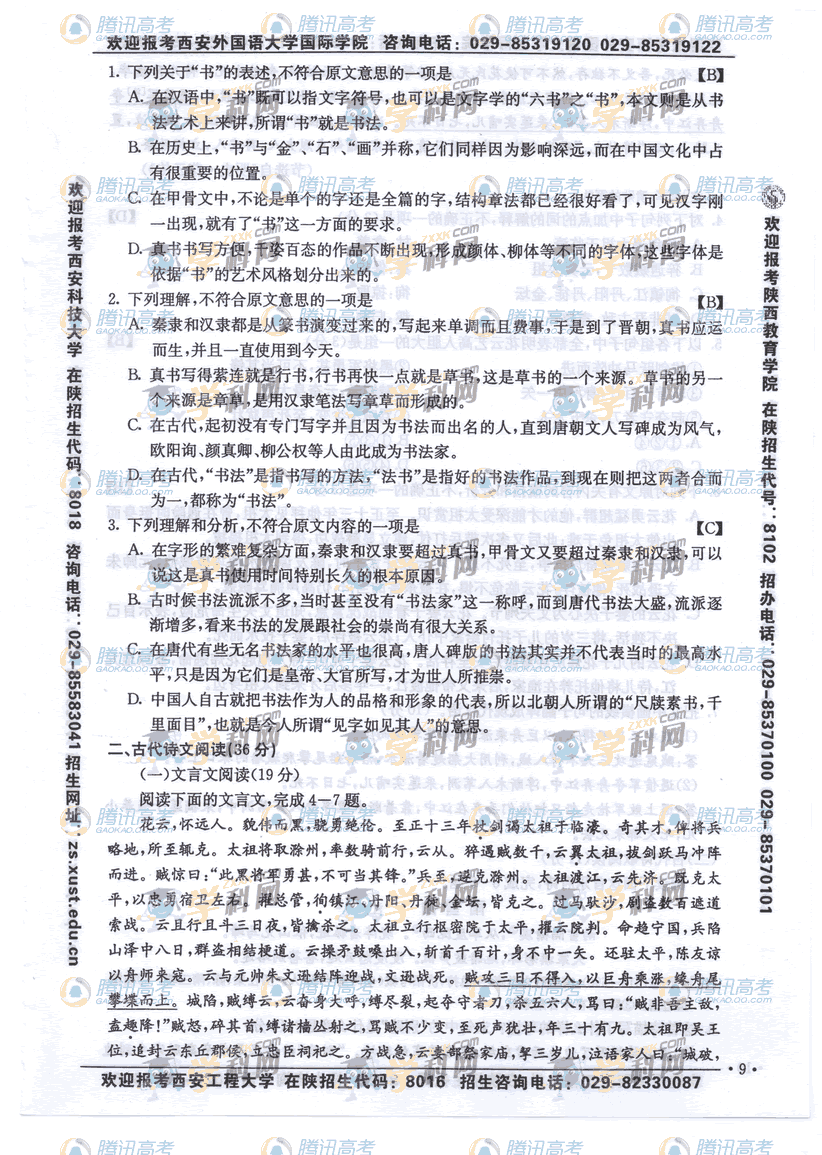 2010年陕西高考语文试题答案