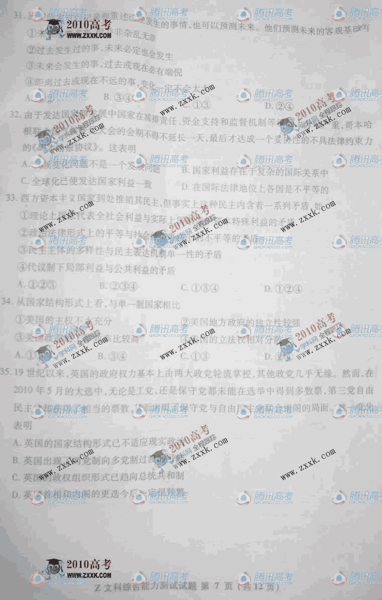 2010年浙江高考文综试题试卷 2010年高校招生全国统一考试文综(浙江卷)