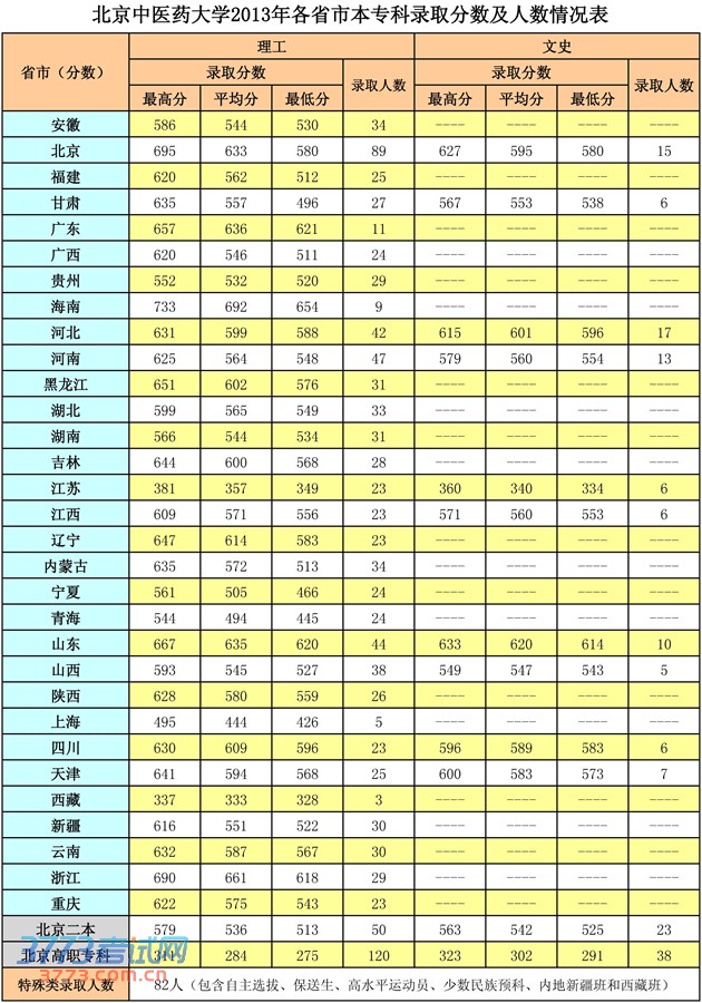 北京中医药大学2013年各省市本专科录取分数及人数情况表
