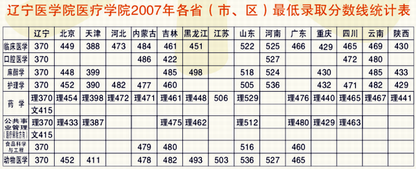 辽宁医学院医疗学院2008年各省市录取最低分数线