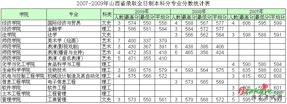 2007-2009年深圳大学在山西省录取分数线