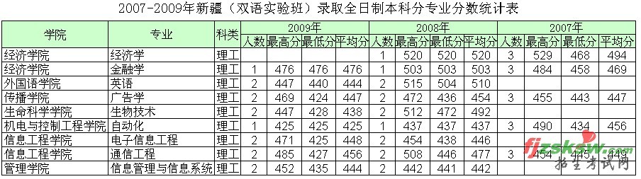 2007-2009年深圳大学在新疆双语实验班录取分数线