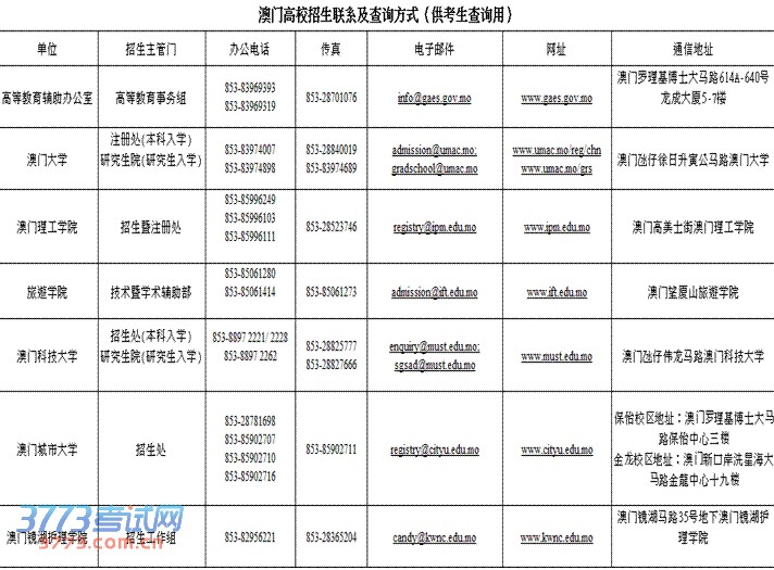 澳门高校招生联系及查询方式(供考生查询用)