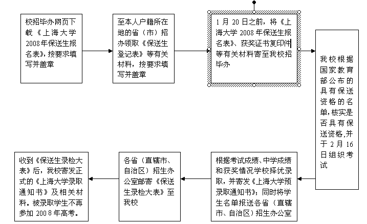 1 、学生可在我校招毕办网页(http://www.shu.edu.cn/zbb/index.htm)下载《上海大学2008年保送生报名表》,尽早填写并寄送我校招毕办,以便我校及时确定具有参加保送生考试资格的初选名单;
