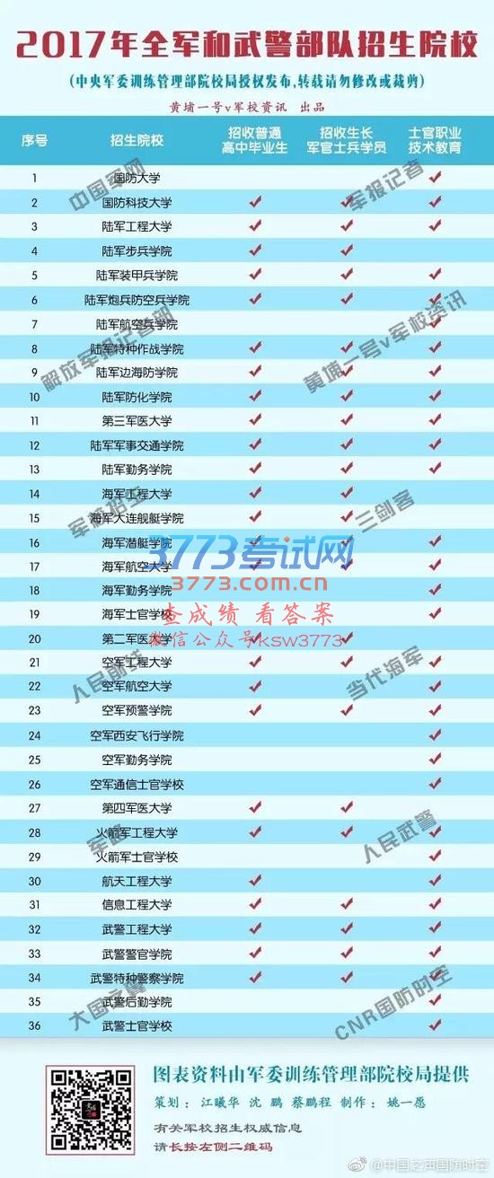根据军队招生工作计划,经军委机关招生主管部门授权,我们与“黄埔一号v军校资讯”联合发布“2017年军队院校招生单位名录”。目录中的这些院校,都是军改后院校的新名称,且为首次成体系曝光。需要说明的是,这36所院校只是今年招生的院校,并非军改后的所有院校。