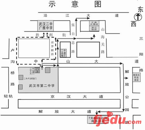 3、汉口火车站出站:509至永清街下,下车后问轻轨黄浦路车站即到武汉二中