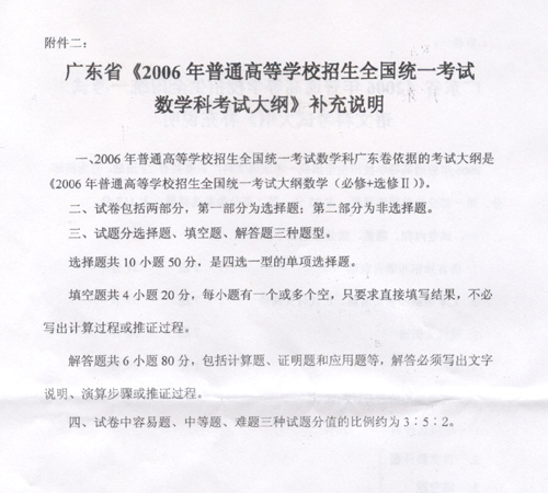 广东省《2006年普通高等学校招生全国统一考试数学科考试大纲》补充说明