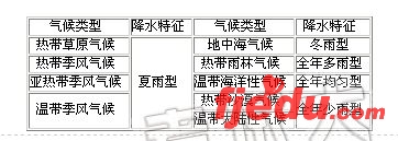 B、从降水上看,可以将世界气候类型归纳为以下四种:(见下表)