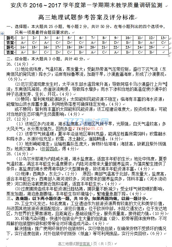 安庆市2016~2017学年度第一学期期末教学质量调研监测高三地理试题参考答案及评分标准