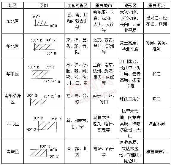 在对我国进行区域空间定位时,用23°26′N、30°N、40°N三条纬线和120°E、100°E、80°E三条经线进行区域划分。依据我国各地区位置、气候、地形、经济联系等因素,把我国共分成六个区域(如表1)。