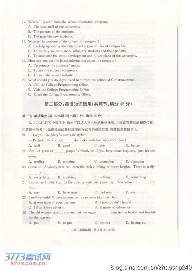 鹤岗三中2014高三期中考试英语试题及答