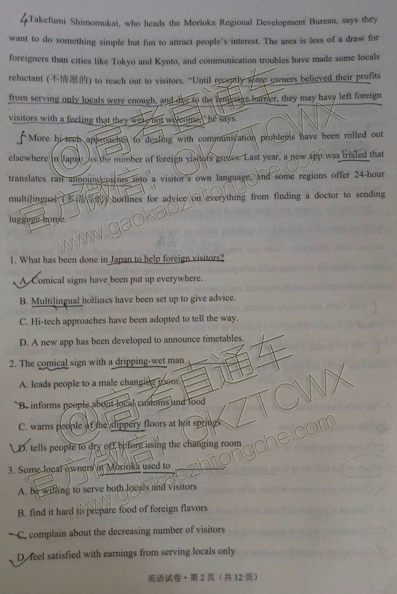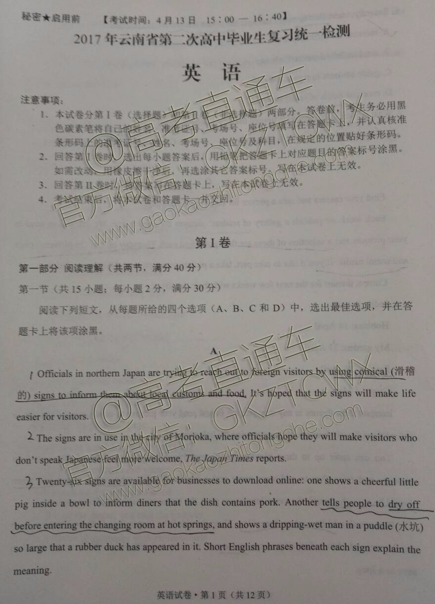 2017云南二统英语试题及答案发布