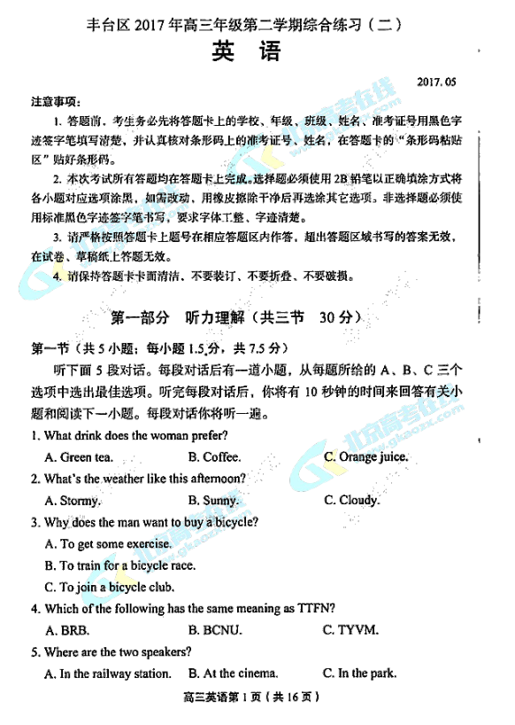2017丰台高三二模英语试卷&答案