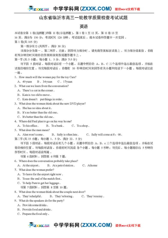山东省临沂市高三一轮质量检查考试-英语