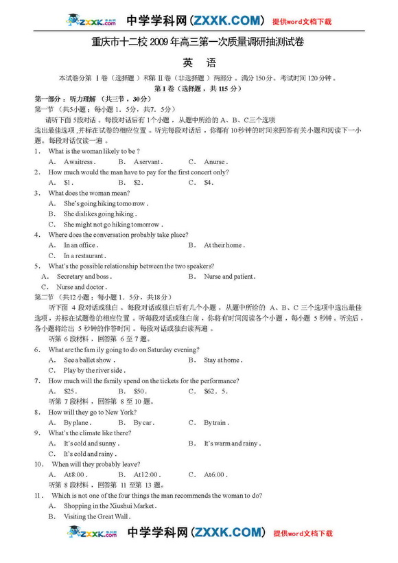 重庆十二校O9年高三第一次调研试卷-英语