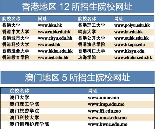 参加当年6月普通高校统一招生文化考试的本市考生均可报考上述香港地区的12所高校。其中香港中文大学、香港城市大学参加本科提前批次统一录取,其他10所高校的报名和咨询事宜由招生院校自行负责。香港中文大学、香港城市大学的招生专业列入本科提前批次招生计划目录中,有意报考这两所高校的考生,在填写志愿表时按规定的批次、代码填报即可;录取时,与其他高校志愿一样按填报志愿顺序进行投档,一旦被录取,则其他院校不再录取。考生如欲报考香港地区其他10所高校,可直接从相应学校的网站上自行下载报名申请表,分别向所要报考的高校函寄报名表并缴纳报名费(可单报也可兼报);上海市教育考试院负责向10所香港地区高校提供报名考生高考成绩;香港高校再通过测试、面试后进行录取。填报香港地区高校的考生也可同时填报澳门地区大学(既可单报也可兼报)及内地高校。被香港地区高校录取的考生,其他内地院校不再录取。