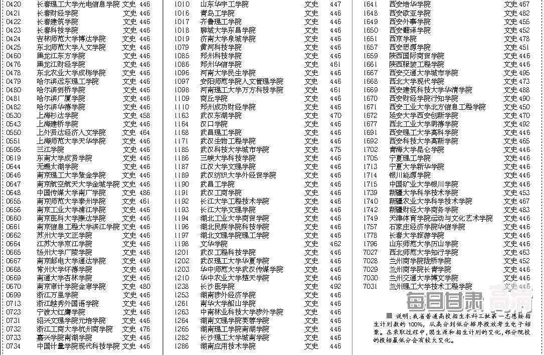 说明:我省普通高校招生本科三批第一志愿按招生计划数的100%,从高分到低分排序投放考生电子档案。在录取过程中,因生源和招生计划的变化,部分院校的投档最低分会有较大变化。