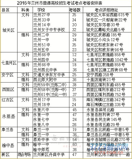 中国甘肃网5月31日讯 据兰州晨报报道 (记者 魏娟 实习生 罗婷) 高考在即,5月30日,兰州市招办公布了2016年高考兰州市考点安排。今年,兰州市三县五区及兰州新区共设9个考区27个考点,比去年减少了3个考点。为了方便在兰州新区就读的舟曲考生参加高考,今年继续在兰州新区设置考点,舟曲考生不用回到舟曲参加高考。