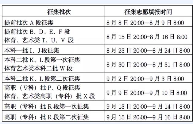 本科提前批A段、 B段、C段、D段、E段、F段、G段,本科一批H段、I段、J段,本科二批K段、L段,高职(专科)批P段、Q段,体育、艺术类本科一批(T段、U段、V段),体育、艺术类本科二批(W段)。