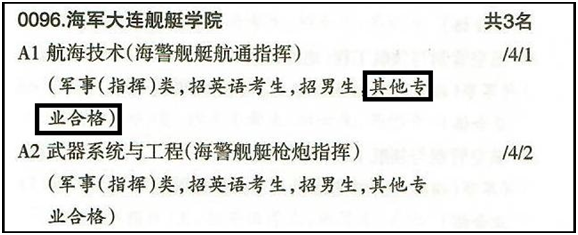 其次,要根据自己的体检合格结论进行报考。新的体检标准实施后,体检合格结论共有指挥、装甲、特战、医疗、其他等15项合格专业类型,同学们可能符合其中的一项至全部项目,大家要根据当年的普通高等学校招生专业目录中明确的各专业体检标准要求选择。如海军大连舰艇学院航海技术(海警舰艇航通指挥)专业,要求“其他专业合格”(如图),体检合格结论中有其他专业合格一项的就可以报考该专业。