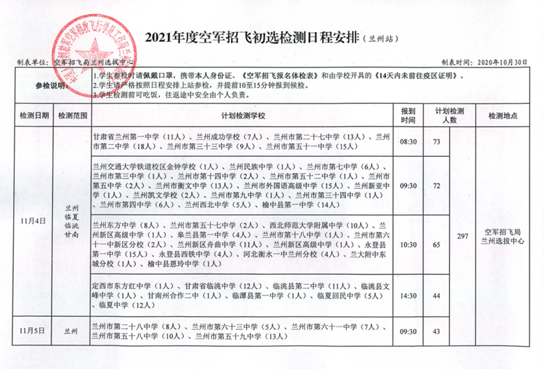 2021年度空军招飞初选检测日程安排(兰州站)