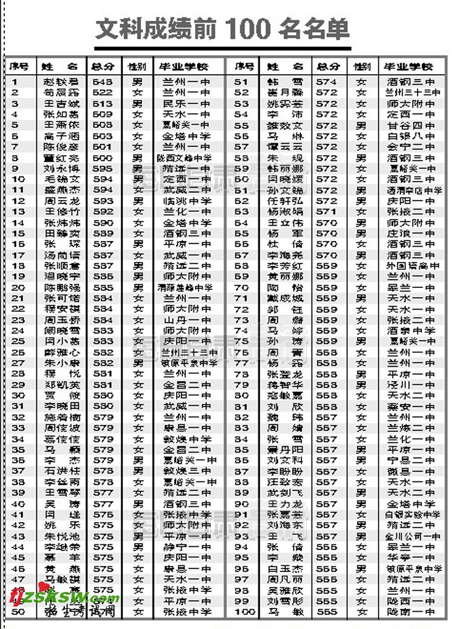 甘肃2011高考文科前百名榜单