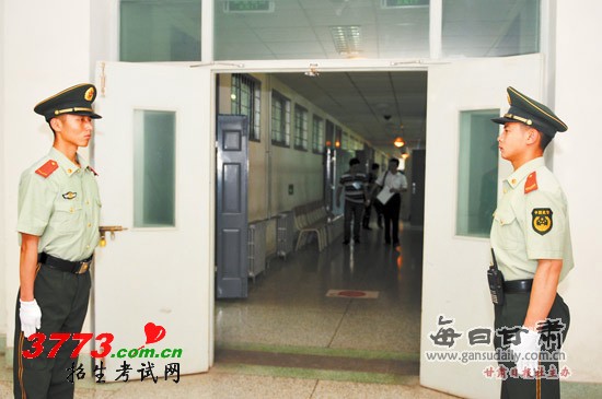 6月12日,两名武警战士在西北师大评卷点执勤。本报记者 房毅 摄