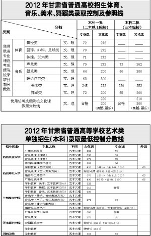 甘肃新闻网兰州7月4日电 据兰州晨报报道:7月3日,省招办公布了2012年甘肃省普通高校招生体育、音乐、美术、舞蹈类录取控制及参照线。今年,各科类专业课分数线与去年相比变化不大,部分科目文化课分数线略有上升。