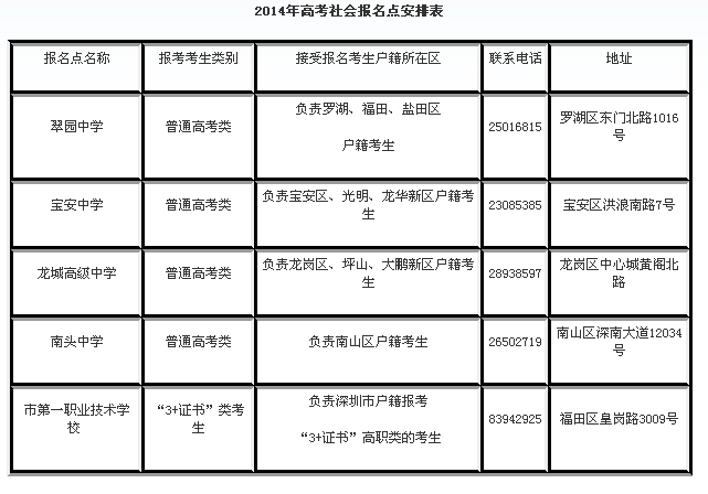 据悉,为了方便深圳市户籍社会青年及学籍不在深圳的本市户籍应届高中毕业生报考,市招考办在全市共设置了5个社会报名点,其中翠园中学报名点负责罗湖、福田、盐田区户籍考生报考,南头中学报名点负责南山区户籍考生报考,宝安中学报名点负责宝安区、光明、龙华新区户籍考生报考,龙城高级中学报名点负责龙岗区、坪山、大鹏新区户籍考生报考,市第一职业技术学校报名点负责3+证书高职类的考生报考。