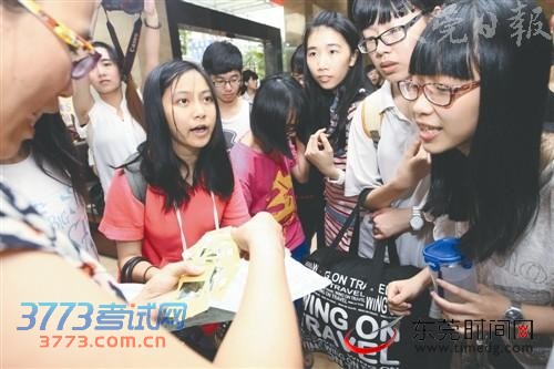 ■昨日,跨校考生开始入住酒店。图为厚街中学学生入住南城广彩城酒店,领取房卡 本报记者 郑家雄 摄