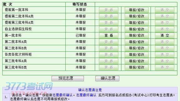 核对后可以在页面最下方的点击“志愿查看、修改或确认”按钮,返回浏览各批次志愿状态情况的页面,如下图所示: