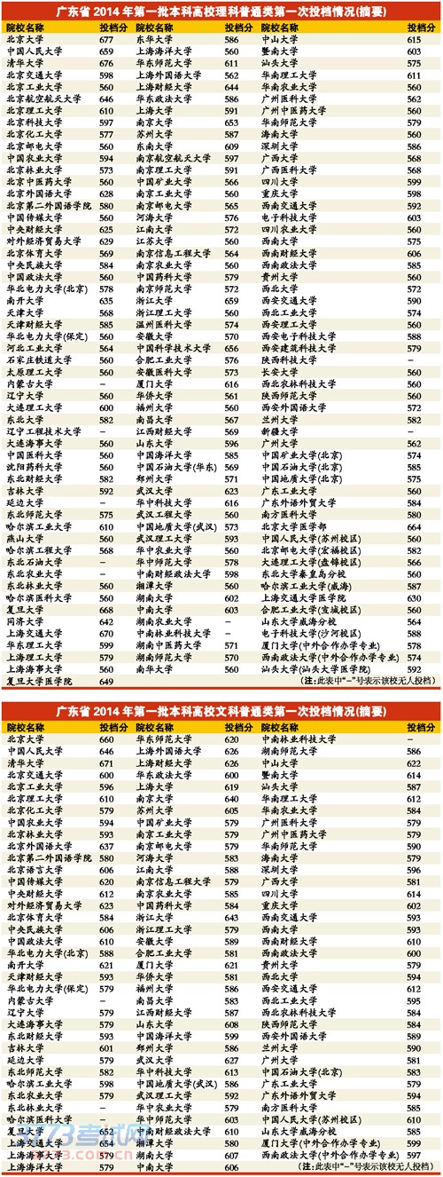 广东省2014年第一批本科高校录取工作开始。外省高校中,北大、清华、上海交大、复旦、人大、浙大、南京大学、中科大等高校生源很好。而省内高校则延续近年来中大“老大”,华工、暨大分列理科、文科第二名的格局。