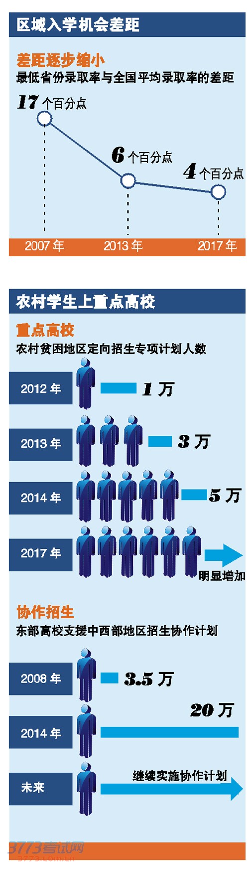将进一步提高中西部地区和人口大省高考录取率,在东部地区高校安排专门招生名额面向中西部地区招生,要求部属高校公开招生名额分配原则和办法,严格控制属地招生比例,调出的指标主要用于中西部及入学机会偏低的地区。力争到2017年,录取率最低省份与全国平均水平的差距缩小至4个百分点以内。