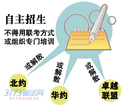 根据《意见》,自主招生试点高校不得采用联考方式或组织专门培训。此前,多所参加自主招生的高校分别组成“北约”、“华约”和卓越联盟三个自主招生联盟,实行联考。按照要求,这些联盟很可能将解散。