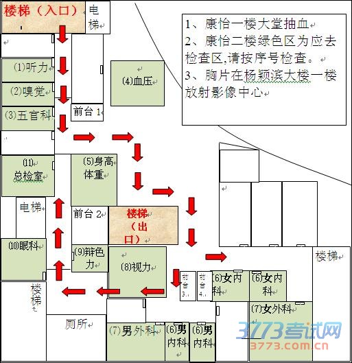 抽血,胸片顺序听现场工作人员安排,其余按1~10的顺序检查,分别为:⑴、听力;⑵、嗅觉 ;⑶、五官科、耳鼻喉科;⑷、血压;⑸、身高体重 ;⑹、内科(分男女);⑺、外科(分男女);⑻、视力;⑼、辩色力;⑽、眼科 ;(如有特殊情况请听现场分诊人员安排)
