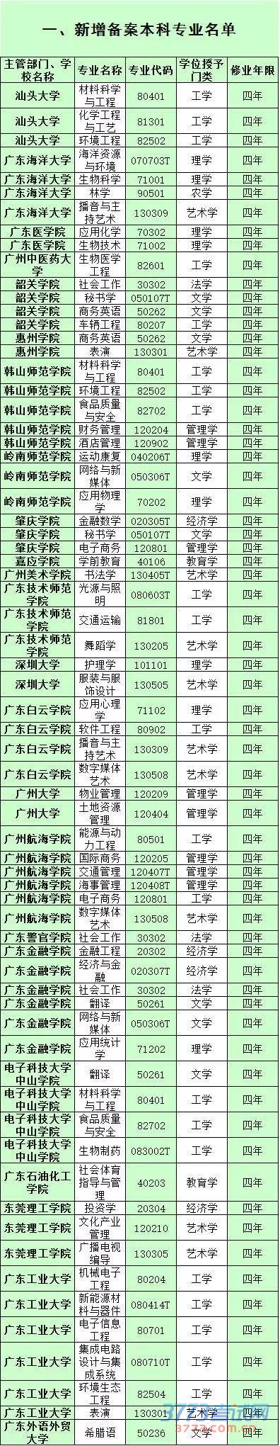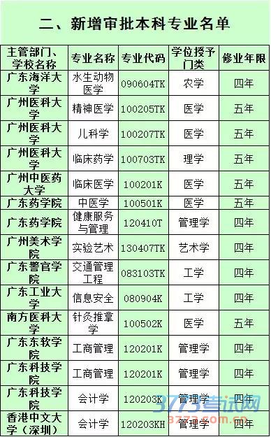 日前,教育部公布了2015年度普通高等学校本科专业备案或审批结果,其中对各地高校申请备案的专业予以了备案,同时确定了审批同意设置的国家控制布点专业及尚未列入目录的新专业名单。记者了解到,广东共有51所高校将新增180个专业,其中在新增备案的本科专业名单中,共有48所高校新增165个专业;此外,在新增审批专业名单中,包括广州医科大学在内的11所广东高校(8所高校与备案专业名单一致)共有15个专业获批,而儿科学、健康服务与管理专业还成为未被列入目录中的新专业。