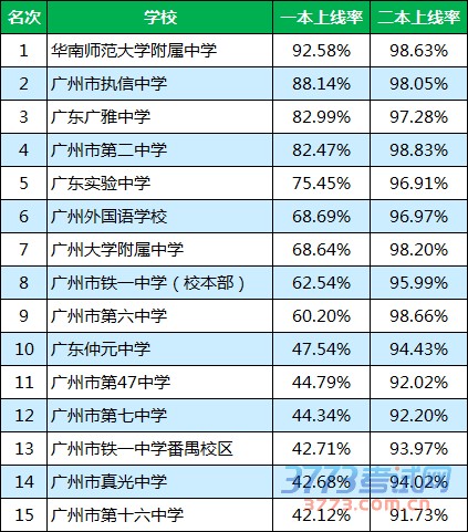 理科一本上线率中,华附是唯一一个一本上线率超过90%的学校,执信、广雅、二中分列二至四位,一本率均超过了80%。省实排名第五,一本上线率也超过了75%。