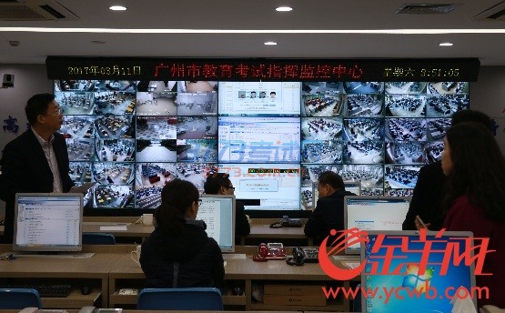 2017高考英语听说考试今日举行,广州市招生办公室的工作人员密切关注考场情况。金羊网记者 汤铭明 实习生 陈小琳 摄