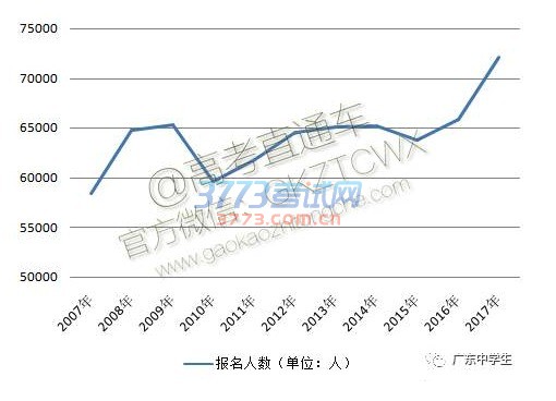 广州市招生办消息,2017年广州市高考共有72060名考生报考,全市共设11个考区、60个考点。 ,今年是近十年以来,广州高考人数最多的一年!