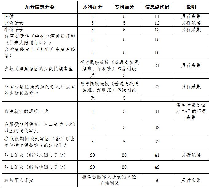 (3)根据广东省招生委员会、广东省教育厅、广东省民政厅、广东省财政厅联合下发的《关于做好2018年退役士兵报考高等职业技术院校工作的通知》(粤招〔2018〕1号)精神,经安置地的县(市、区)民政局审核符合报考2018年高等职业技术院校的退役士兵考生(考生号第5位为“8”),无需提出加分资格申请,各市招生办无需采集,除此之外参加普通高考的自主就业的退役士兵,向市招生办公室提出加分资格申请时均需提供本人退役证和身份证原件及复印件。