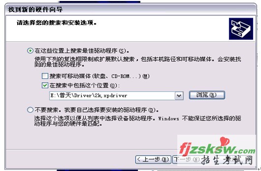 选择如上图所示,在搜索中包括这个位置中选择驱动所在的目录,如果光驱盘符是F盘,那么选择F:\Driver\2k,xpdriver目录。点击下一步完成。