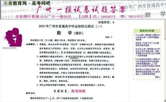 在一家×星教育网的“问吧”,记者看到一篇题为《2010广州一模答案/2010年广州市普通高中毕业班综合测试(一)答案》帖子,当中清晰地扫描出《2010年广州市普通高中毕业班综合测试(一)数学(理科)》字样的试卷题头,并注有:“本网高考问吧已通过关系第一时间获得考试题目及答案”字样。