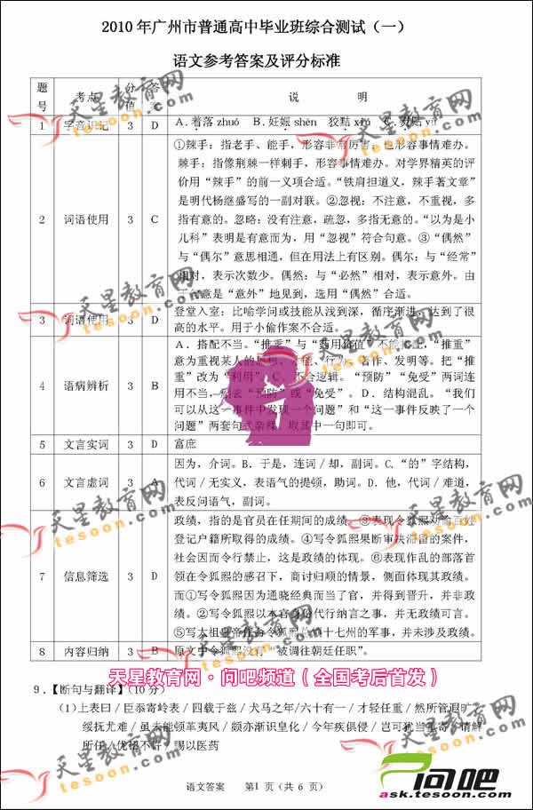 2010年广州一模语文答案/2010年广州市普通高中毕业班综合测试(一)语文答案