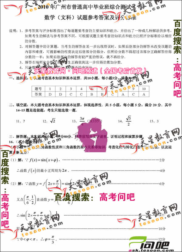 2010年广州一模文科数学答案/2010年广州市普通高中毕业班综合测试(一)文科数学答案
