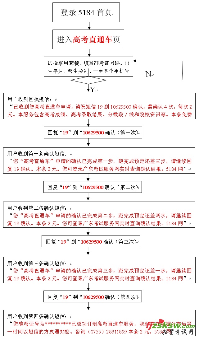 登陆5184首页一一进入高考直通车专题页面——选择享用套餐填写准考证号码、出生年月、考生类别、一至两个手机号码一一短信确认定制(此时网页提醒:您所填写的资料已录入短信平台,您手机将收到我们下发的确认短信,完成预订需根据短信内容发送短信19到10629500确认,共需确认4次(每次确认的端口号均是10629500),每次2元,总信息费8元。本服务包含高考成绩、录取结果、高考分数线/段和院校资讯等。咨询电话:0755-28811899/16883585/020-39338571广东考试服务网。)一一回复所有确认才表示您已经成功定制此优惠套餐。