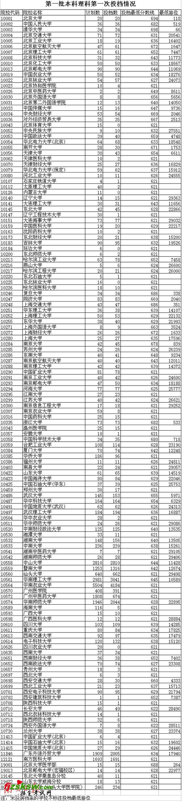 2010年广东省本科一批第一次投档分数线情况 我省第一批本科高校录取工作于12日全面展开。今年我省首次实行平行志愿投档模式改革。从第一次投档情况来看,平行志愿改革开局顺利,达到预期工作目标