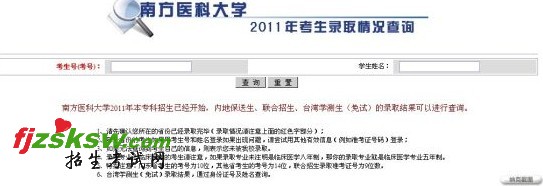南方医科大学2011高招录取结果查询系统已开通,将随录取进程更新数据,感谢关注!特别说明:查询结果仅供参考,考生最终的录取结果以收录取通知书为准。