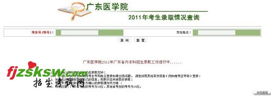 广东医学院2011高招录取结果查询系统已开通,将随录取进程更新数据,感谢关注!特别说明:查询结果仅供参考,考生最终的录取结果以收录取通知书为准。