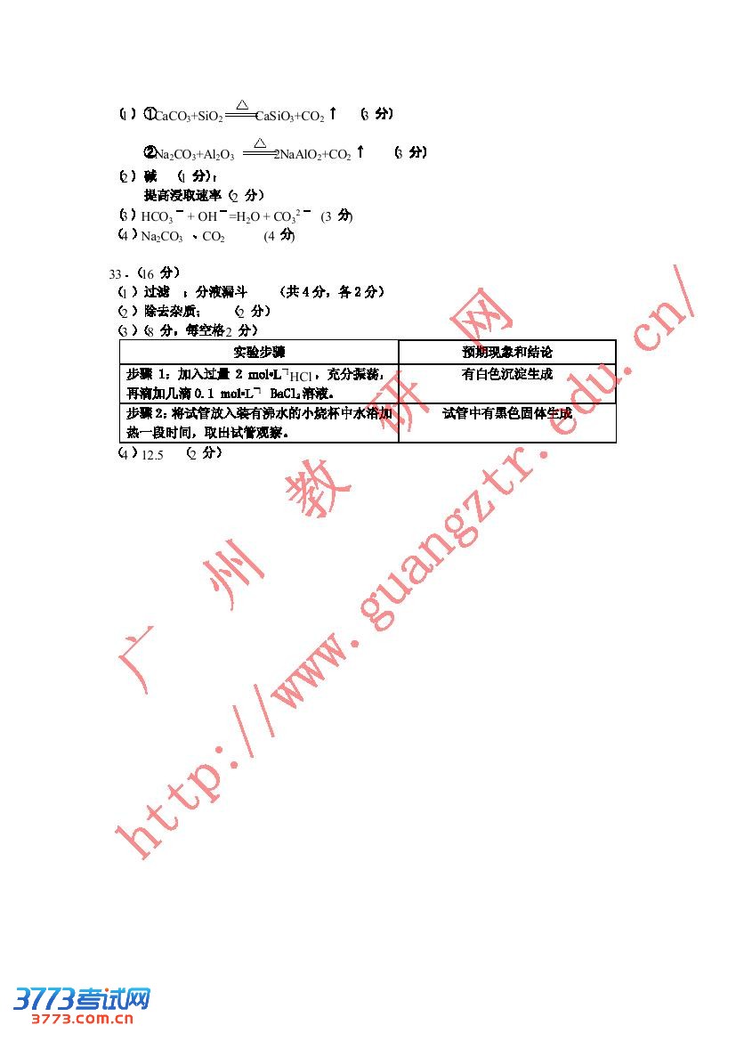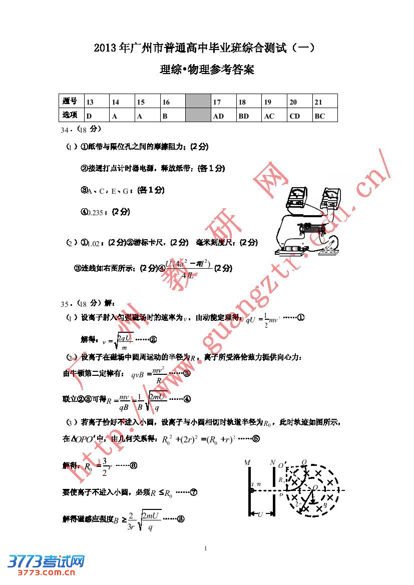 2013年广州一模理综试题答案