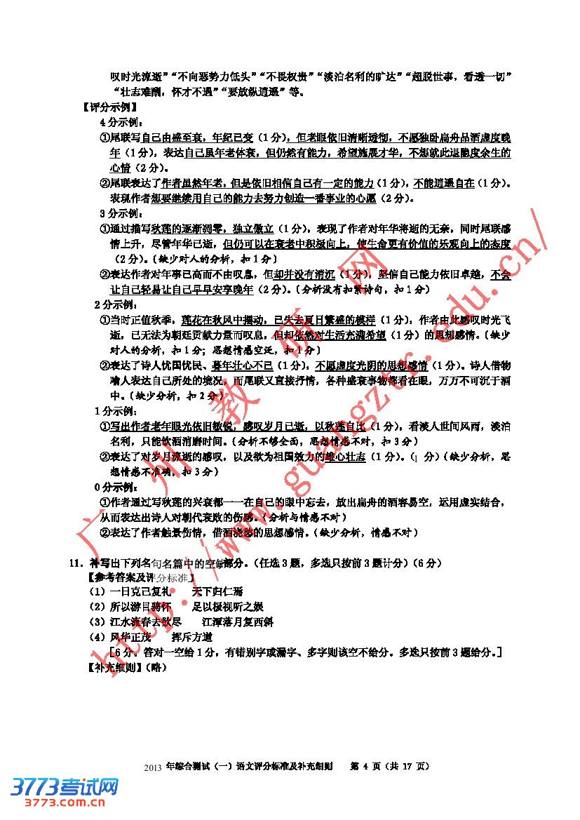 2013年广州市“一模”语文评分标准及补充细则